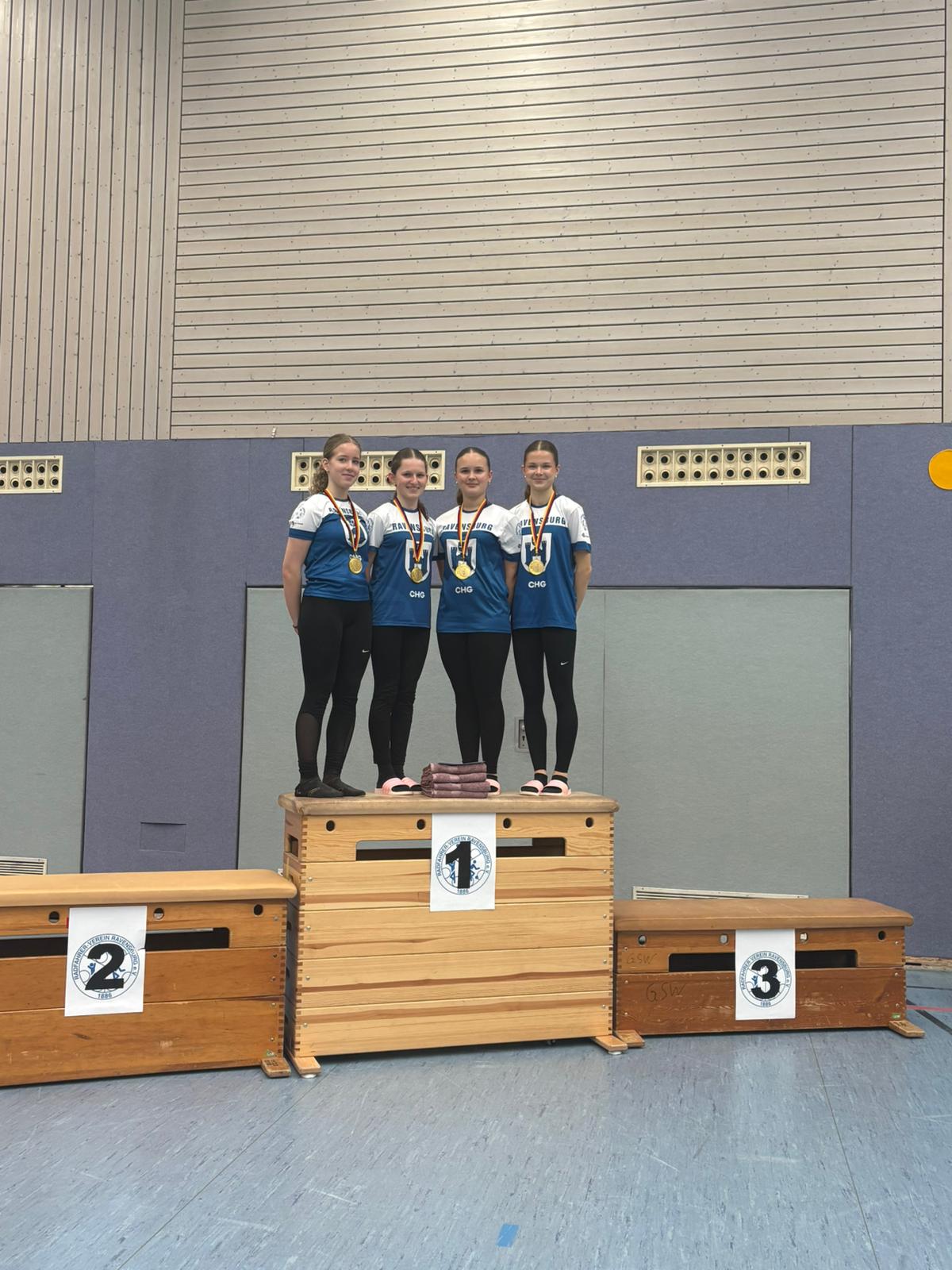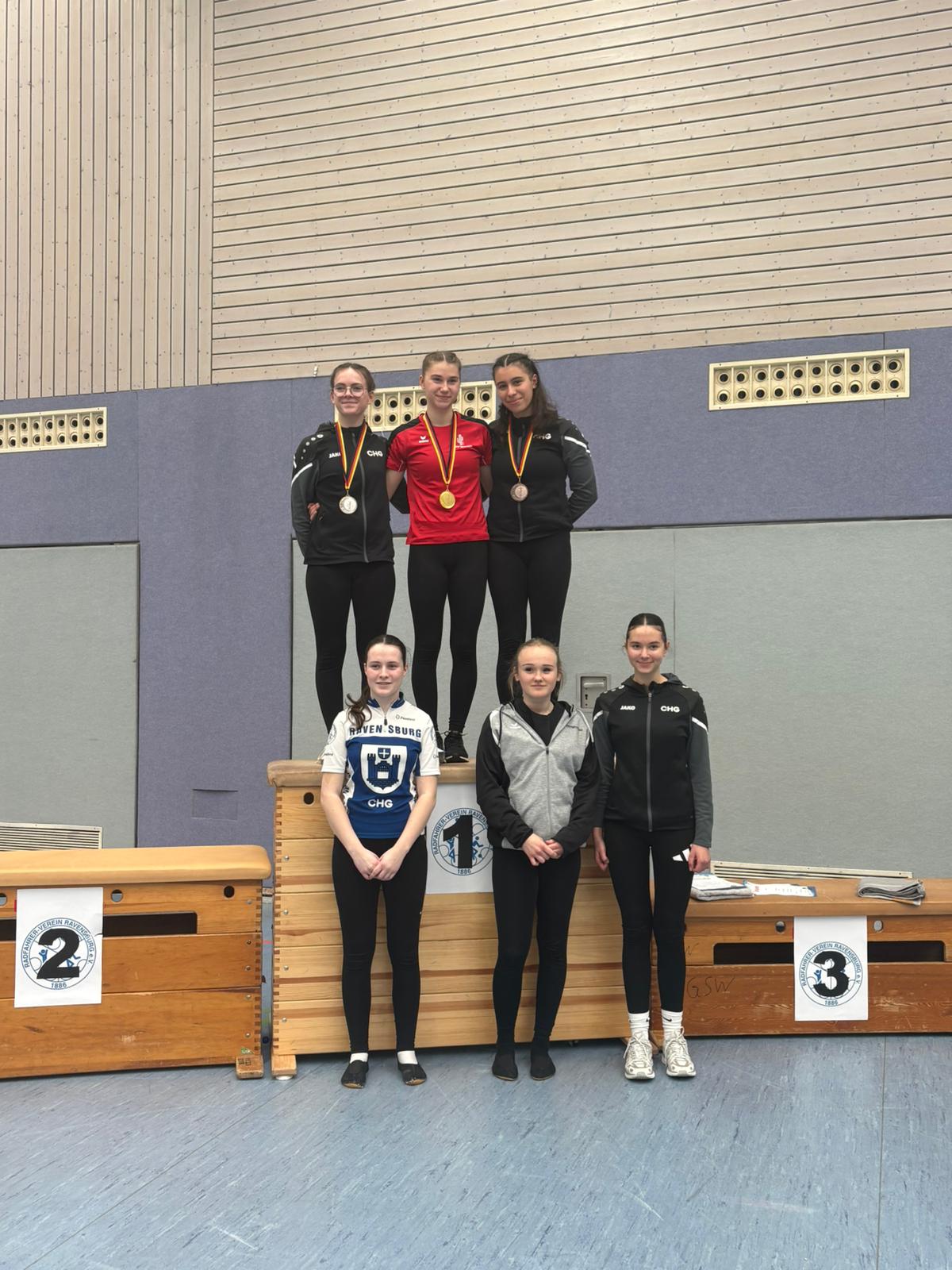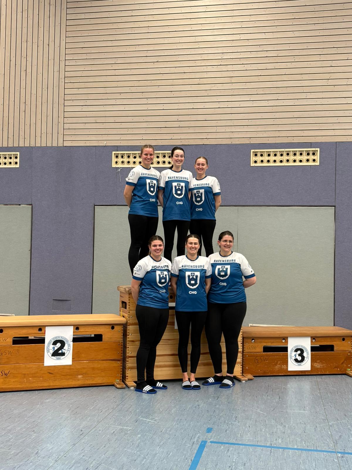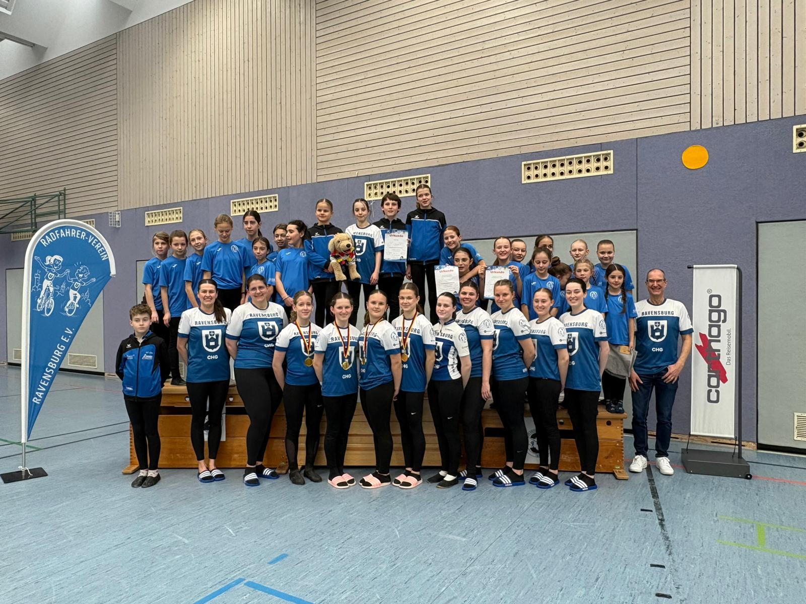 In der Eliteklasse konnten beide Mannschaften des RV Ravensburg im Einradsport überzeugen: Sowohl die 4er-Mannschaft als auch die 6er-Mannschaft sicherten sich jeweils Platz 1, die Goldmedaille und damit die Qualifikation zur Landesmeisterschaft.