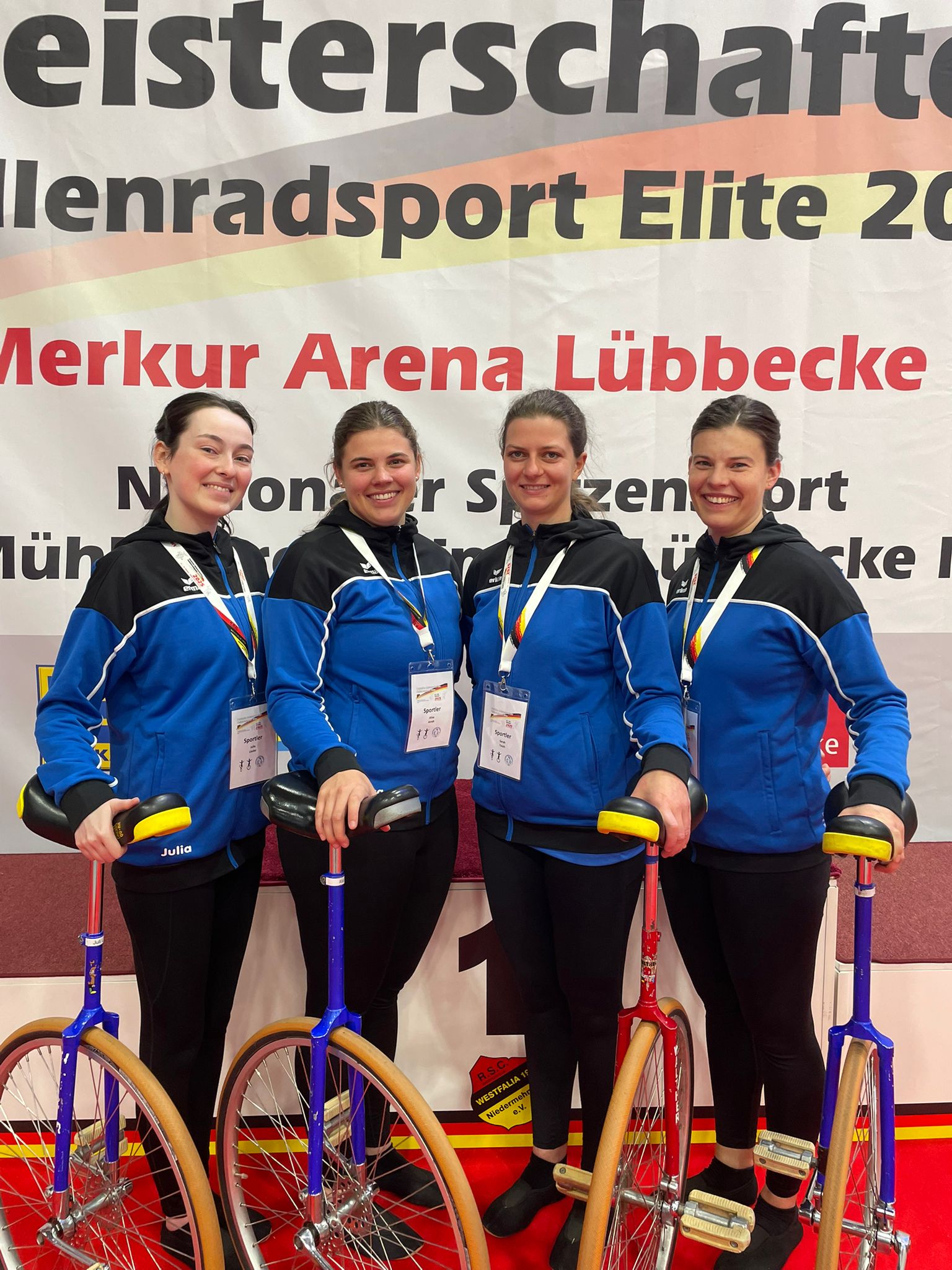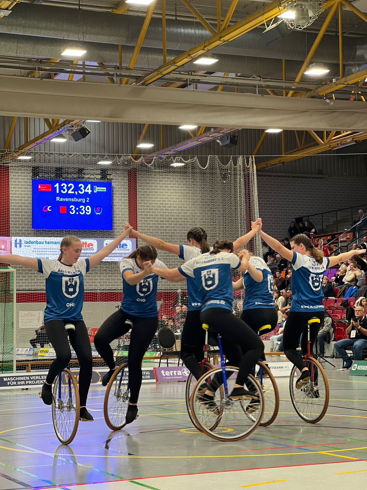 Am Freitag, den 17.10., fiel die Entscheidung im 4er Einrad, bei der insgesamt 18 Mannschaften am Start waren. Die vier Frauen Alisa Arndt, Julia Linder, Sarah Tesch und Sarah Rudolf starteten als erste Mannschaft auf Platz 18 mit eingereichten 141,80 Punkten- das gesetzte Ziel: Die im Training erarbeitete Routine abrufen und einige Plätze gut machen. Nach fünf Minuten ertönt der Applaus und die vier Ravensburgerinnen strahlten über ihren geringen Punktabzug. Mit ausgefahrenen 132,29 Punkten waren sie sehr zufrieden und verfolgten gespannt die folgenden 17 Mannschaften. Am Tagesende konnten der RVR insgesamt 9 Mannschaften überholen und positionierte sich auf einem hervorragenden neunten Platz.